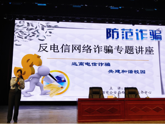 讲座上,姚佳警官提醒师生们当前电信网络诈骗频发,希望大家在生活中进一步提高警惕,认清诈骗的方式和手段,切实确保人身和财物安全,携手共建平安校园。